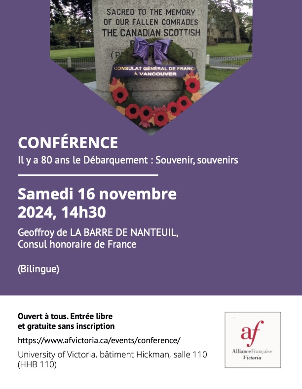 Cette présentation sera faite conjointement par M. Geoffroy de la Barre de Nanteuil, consul honoraire de France à Victoria et par M. Stanley J. Willow, LCol (retd), ancien commandant et membre du conseil d’administration du Canadian Scottish Regiment à Victoria.