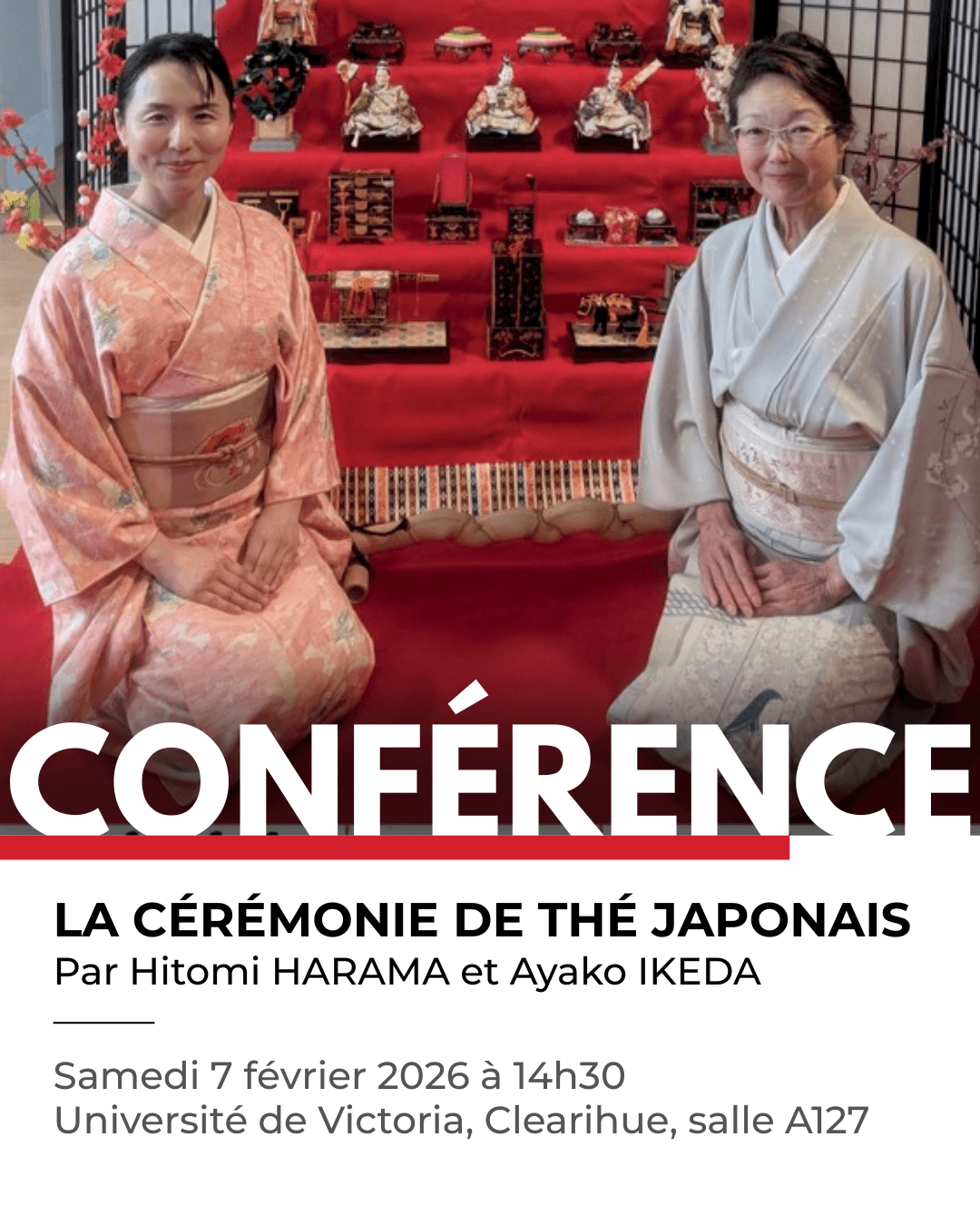 Ayako IKEDA procédera ensuite à la cérémonie du thé avec un ou deux invités, dans le style « ryurei », c’est-à-dire sur des tables. Cet événement vous permettra de découvrir les quatre principes de la cérémonie de thé japonaise : "Wa-Kei-Sei-Jaku" (和 敬 清 寂) : Harmonie, Respect, Pureté et Tranquillité.