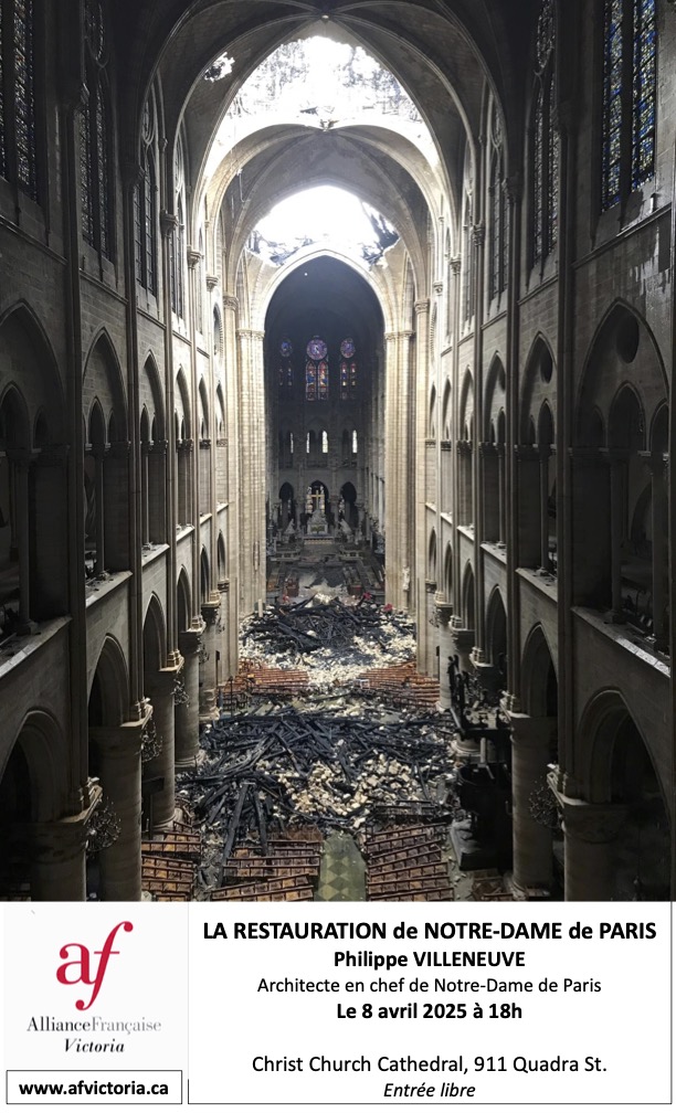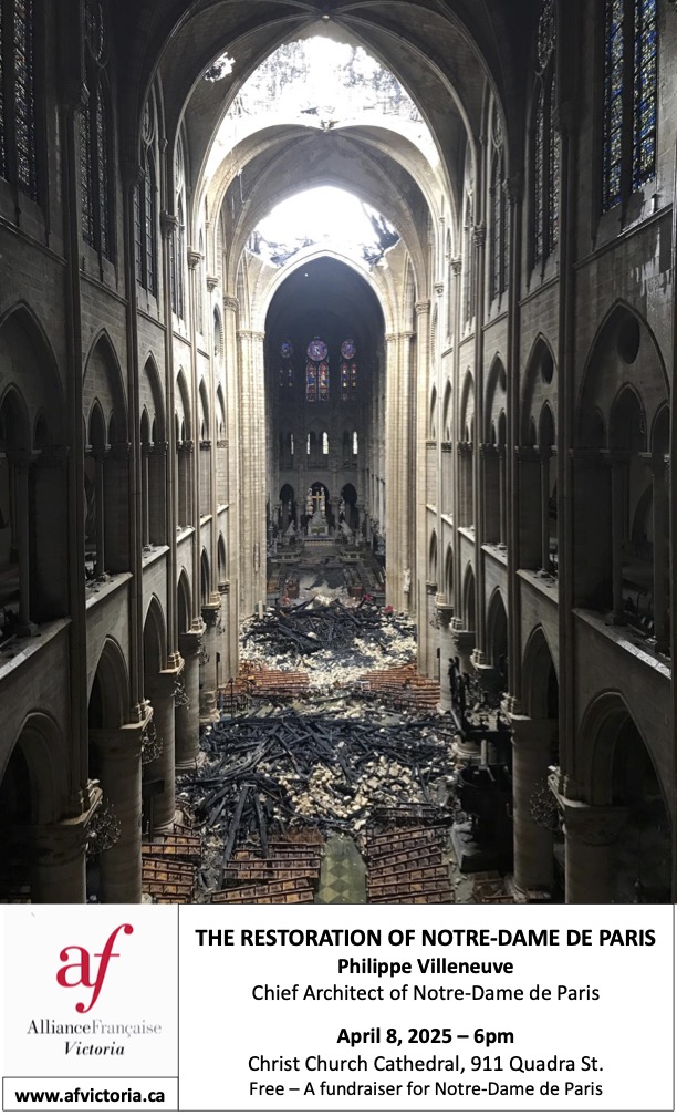 Victoria and its community have a once-in-a-lifetime opportunity to meet the Lead Chief Architect who oversaw the restoration of Notre-Dame de Paris. Philippe VILLENEUVE will be in Victoria for that day to present to the public an insider’s view of the disaster that struck the almost 900-year old monument and its reconstruction. Stunning visuals will be presented.