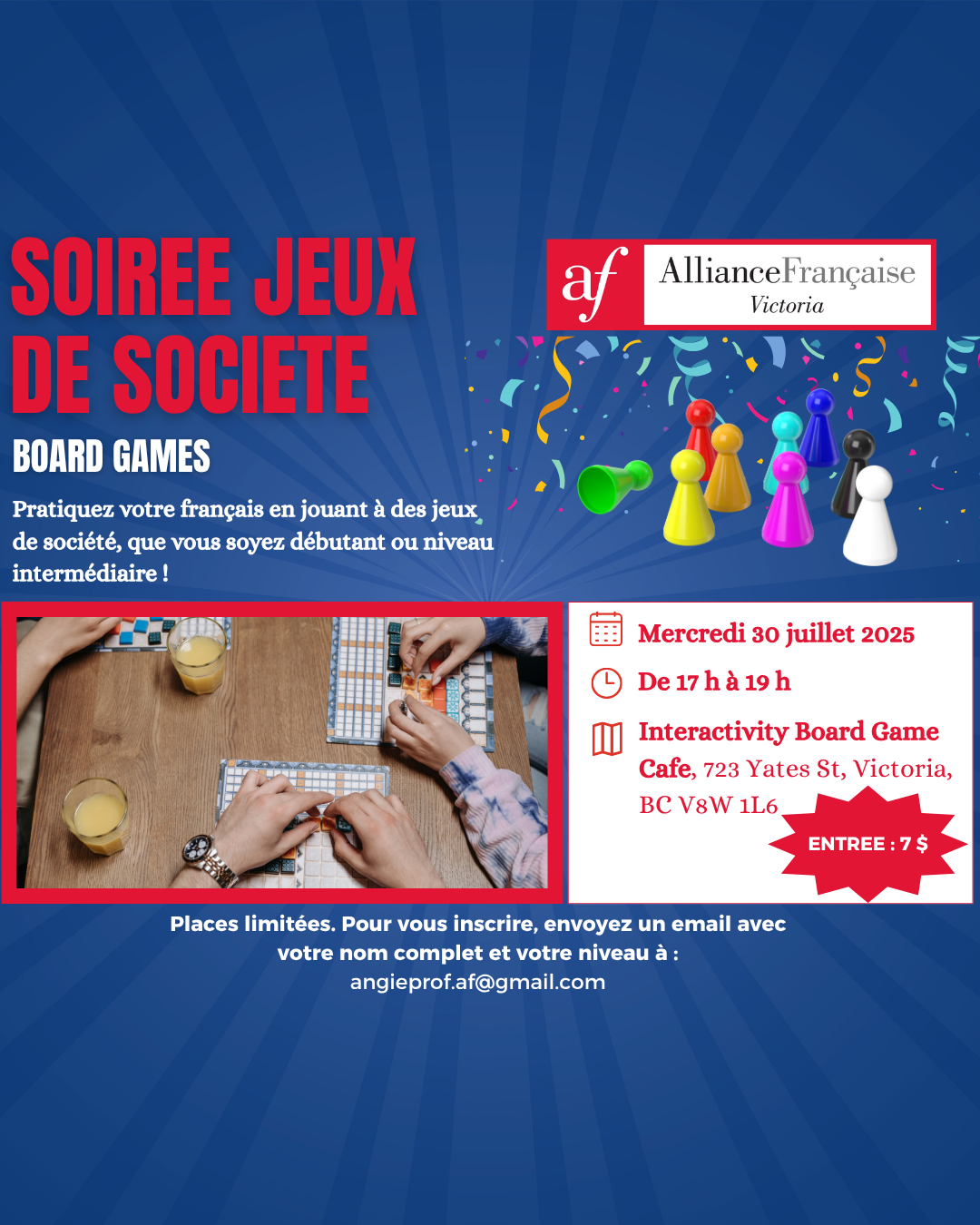 This event has limited spots available, if you want to participate, send us an email with your full name and level of French (beginner or intermediate).